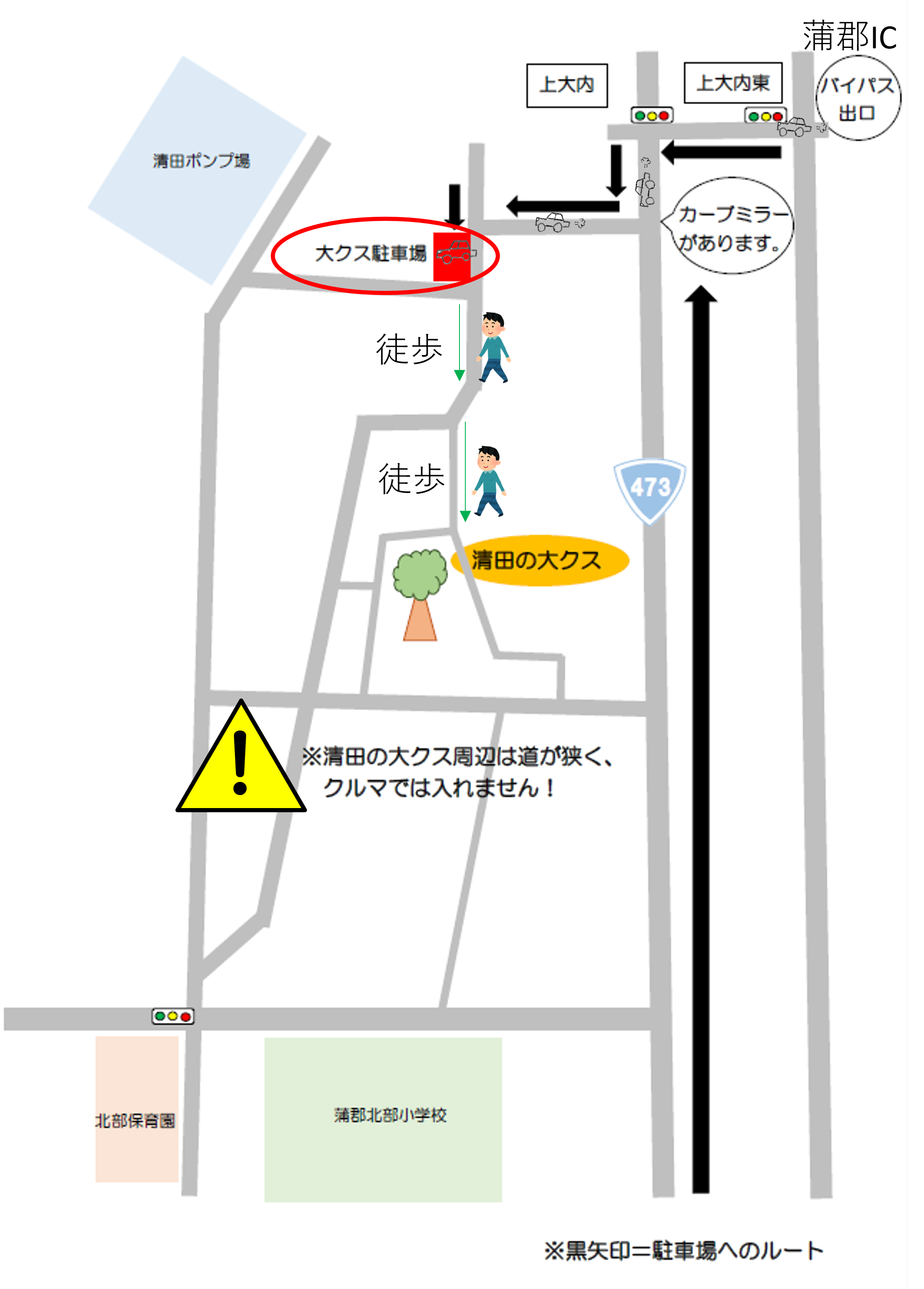 注意点:集合場所の清田の大クスの真下は車が停められません。近くの浄水場手前にある大クス駐車場に停めてくださいますようお願い申し上げます。