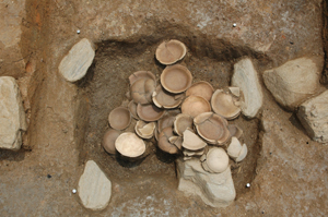 一か所に重ね置かれた二十数枚の盃(土師器小皿)、土師器皿に供物とともに載せて祀られたと推定される金銅製飾り金具などが出土しました。