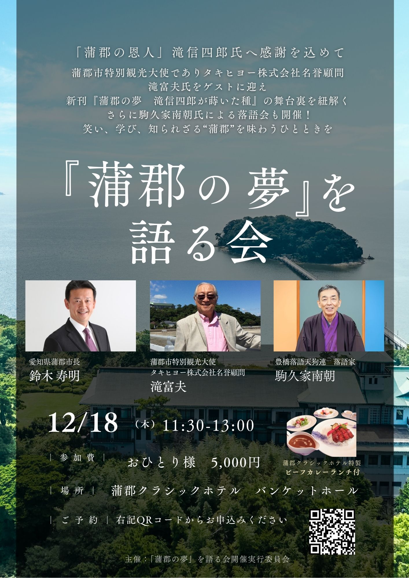 「蒲郡の夢 滝信四郎が蒔いた種」の発行を記念し、蒲郡の恩人と呼ばれる滝信四郎氏の人物像や当時の話をお孫さんにあたる滝富夫氏に伺ったり、駒久家南朝氏による特別な落語の披露などがあります。